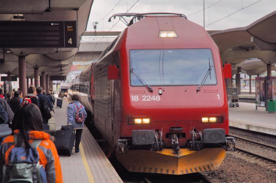 | Am nächsten Morgen erreichen wir pünktlich um 9:30 Uhr Oslo und fahren mit einem Taxi zum Hauptbahnhof. Mit der Bergen-Bahn erleben wir eine faszinierende Tour durch die grandiose norwegische Landschaft. Auf den 470 Kilometern zwischen Oslo und Bergen klettert der Zug nicht nur von Meereshöhe auf 1237 Meter Höhe, sondern passiert auch etwa 200 Tunnel und 300 Brücken. Mit Recht wird gesagt, die Bergen-Bahn sei eine der schönsten Eisenbahnstrecken der Welt. | |