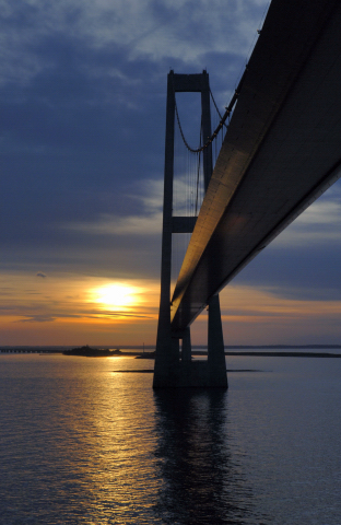 | Bei letztem Tageslicht passieren wir die Brücke über den Storebelt, die größte Hängebrücke Europas. | |