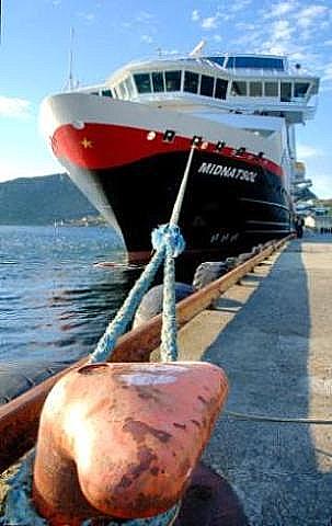 Noch eine Anmerkung bzw. ein Fototipp: Ihr Schiff ist 12 Tage lang ständig in Bewegung und die majestätische Landschaft zieht wie in einem Film an Ihnen vorbei. Da heisst es, wie ein Luchs aufzupassen, um die besten Motive im einzigen richtigen Augenblick aufzunehmen. Wegen der leichten Vibration des fahrenden Schiffes ist ein Stativ überflüssig und wegen der stark wechselnden Lichtverhältnisse sind Digitalkameras mit der Möglichkeit, die Aufnahmeempfindlichkeit zu verändern ohne einen Film wechseln zu müssen, von grossem Vorteil. Und wenn das Schiff nicht auf See ist, sorgen die insgesamt 59 Häfen mit 128 An- und Ablege-Manövern für Abwechslung. Dazu kommen Städte mit so klangvollen Namen wie Trondheim, Tromsö oder Hammerfest, die natürlich auch besichtigt werden wollen. Ganz zu schweigen von den Vesteralen und Lofoten. Kurzum: ich war ganz froh, daß zwischendurch auch noch ein wenig Zeit zum Schlafen blieb(ohne Mitternachtssonne).