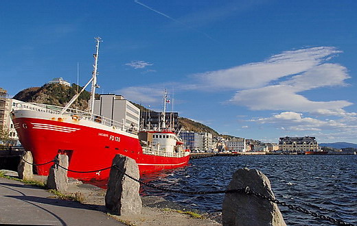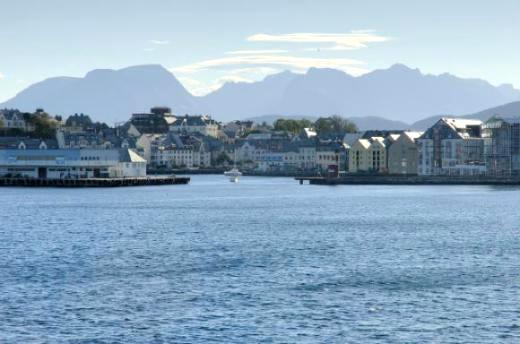 | Bei herrlichem Wetter und ruhiger See erreichen wir Alesund. Auch hier bietet die im Jugendstil (wieder-)errichtete Altstadt viele Fotomotive und vom Hausberg "Fjellstua" (418 Stufen !) aus geniesst man einen herrlichen Panoramablick über die Stadt (ca. 40.000 Einwohner). Bilder, die auch die Prospekte zieren. Hier deshalb der Blick auf Alesund von der Seeseite vor dem Anlegen. | |