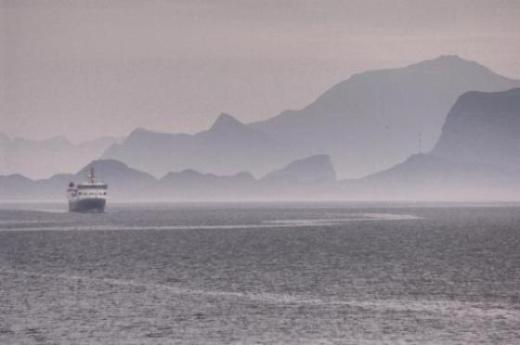 Bald darauf, inzwischen haben wir den Polarkreis überquert, erscheint aus dem Dunst des massiv schlechter werdenden Wetters die südgehende "Lyngen". Da die Hurtigruten-Schiffe täglich ihre Reise beginnen, begegnen wir auch täglich pünktlich den Schiffen auf dem Gegenkurs. | |