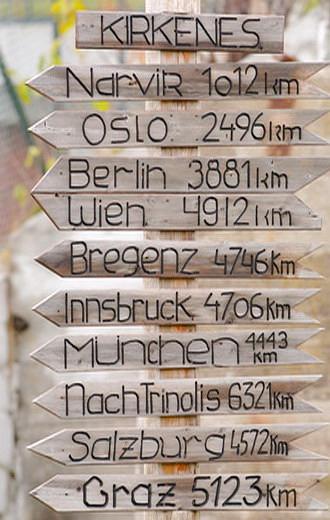 | Wie entlegen und nördlich Kirkenes liegt, zeigt dieses Hinweisschild: der Nordpol ist näher als die Landeshauptstadt Oslo und wenn man die Entfernung nach München von dort nach Süden abträgt, erreicht man fast den Äquator. Trotzdem ist dank des Golfstroms auch Kirkenes das ganze Jahr über eisfrei während der südlicher liegende nördlichste Punkt von Alaska im Winter von Schnee und Eis überzogen ist. | |