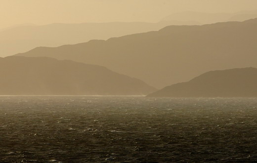Trotzdem lassen wir uns das Abendessen schmecken, auch wenn Gläser wegen des Seegangs einfach umkippen und Teller unvermittelt seitlich vom Tisch rutschen. Der Speisesaal scheint aber deutlich leerer zu sein als sonst. Nachts ändert der Kapitän die Route ein wenig, fährt mehr unter Land und am nächsten Morgen ist das Gröbste überstanden. | |