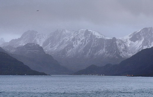 | Und dann öffnet sich unvermittelt der Trollfjord, der nur knapp 100 m breit ist und dessen Felswände seitlich bis zu 600 m steil aufragen. | |