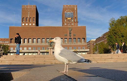 Norwegens Hauptstadt Oslo präsentiert sich bei strahlendem Wetter. Hier das Rathaus, in dem jedes Jahr auch einige Nobel-Preis-Zeremonien stattfinden. Die Möwe können auch Sie ins rechte Licht rücken, wenn Sie bereit sind "zu Boden zu gehen". | |