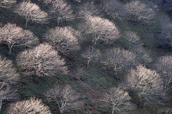 | Bald erreiche ich über winzige Nebenstraßen eine Landschaft mit ausgedehnten Baumbeständen: Esskastanien. |