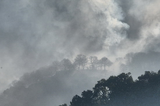 | Zuerst vermutete ich Waldbrände als Grund für die Rauchschwaden, die Land-schaftsaufnahmen in der Totalen vereitelten. Tatsächlich waren es aber kontrollierte Feuer; die Esskastanien werden in den Wintermonaten gestutzt und das entfernte Holz wird von den Bergbauern verbrannt. |