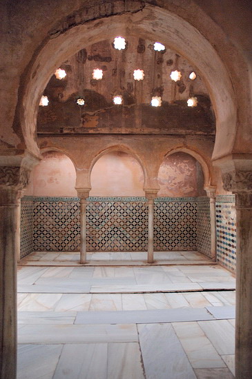 | Von außen erscheint die Alhambra wie ein Zweckbau, im Innern aber be-zeugen Säulen, Bögen und Ornamentik, Gärten und Wasserspiele den Höhe-punkt arabisch-andalusischer Baukunst. |