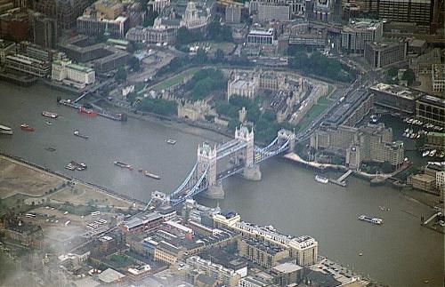 Mit dem Flugzeug über den Kanal nach England London Tower und Tower-Bridge aus der Vogelperspektive |